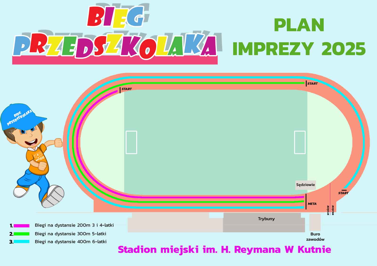 Po wspólnym zdjęciu na płycie stadionu wystartowały biegi. Najpierw na trasę wyruszyły 3-latki wraz z rodzicami, następnie pobiegły 4-latki. Starsze dzieci – 5- i 6-latki – biegły już samodzielnie, a w najstarszych kategoriach przygotowano osobne biegi dla dziewczynek i chłopców.